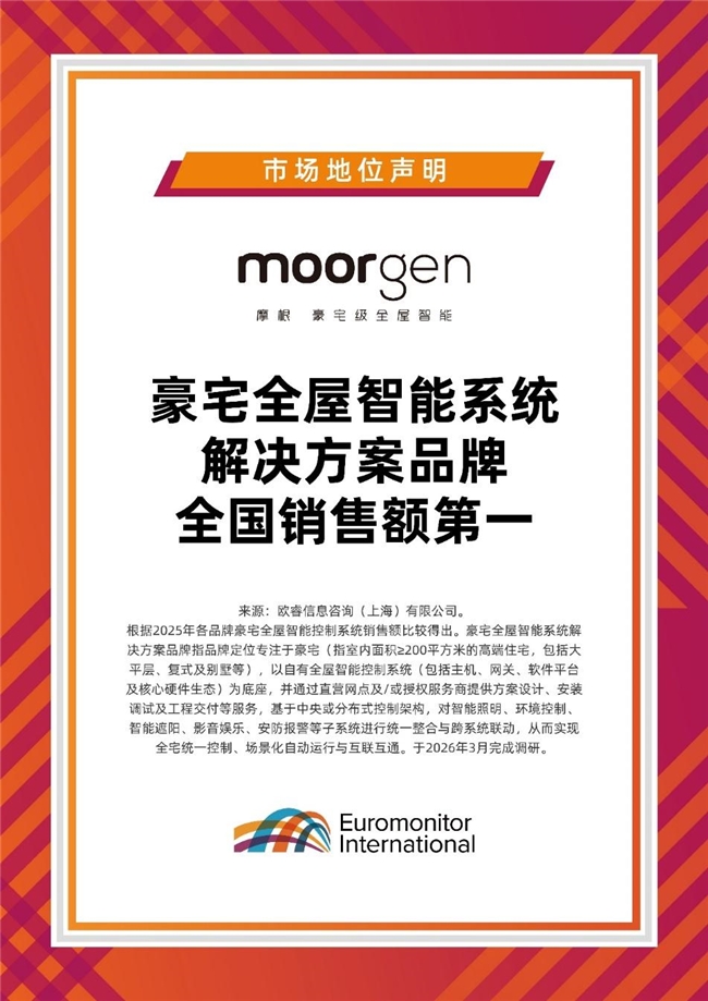 2026年3月,国际调研机构欧睿国际授予摩根“豪宅全屋智能系统解决方案品牌全国销售额第一”的认证。这一认证基于真实市场销售数据的调研,从市场表现、产品落地、用户认可等多维度,客观印证摩根在高端全屋智能领域的领先地位。