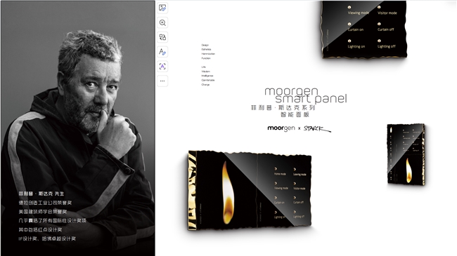 其中,全球设计巨匠菲利普·斯塔克将亲临现场,这位法国国宝级设计鬼才,全球工业设计标杆人物,同时也是法国奥运会金牌设计者,曾主持法国爱丽舍宫总统私宅改造。其作品超 10000 件,覆盖建筑、家居、产品等全领域,可谓是全球顶奢品牌争相合作的设计巨匠。此前,摩根 Moorgen 与其联手共创的“火与石”系列智能面板,以“让日常用品成为承载情感与美学的艺术品”为核心,赋予开关面板独特的视觉与触觉质感,收获市场高度好评。